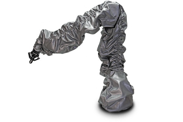 Für Lackieranwendungen oder der Einsatz in einer stark verschmutzen Umgebung eignet sich unsere Hülle aus Tyvek. Um den Roboterarm vor Schäden beim Schweißen zu schützen, sollten sie unbedingt auf den Schweißschutz zurückgreifen. Beispielsweise bei der Beladung von zerspanenden Anlagen ist die Gefahr hoch, dass die zum Teil aggressiven Kühlschmierstoffe die Dichtungen der Gelenke angreifen. Dies wird früher oder später zu einem Gelenkschaden führen. Um einen Stillstand und die Kosten einer Reparatur zu vermeiden, ist der Einsatz der Spritzwasserschutzhülle sehr zu empfehlen.